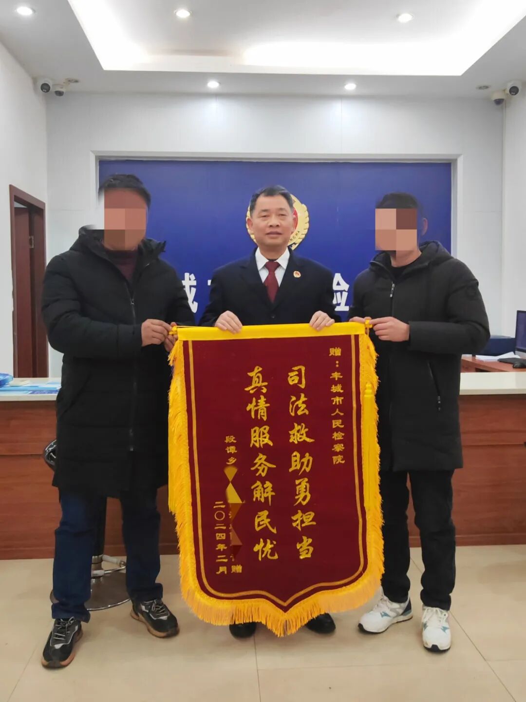 近日,司法救助申请人陈某乙的大伯陈某甲将一面书写着“司法救助勇担当,真情服务解民忧”的鲜红锦旗送到了我院第六检察部干警的手中,陈某甲说“感谢检察院、感谢检察官,这笔司法救助金对我侄女陈某乙来说至关重要,我代表她感谢党和政府的关怀。”