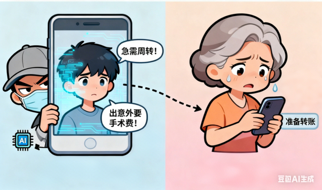 骗子利用“AI换脸”及声音模拟技术,生成虚假视频,制造出受害人亲友紧急且合理的情景,利用受害人恐慌心理,骗取钱财。