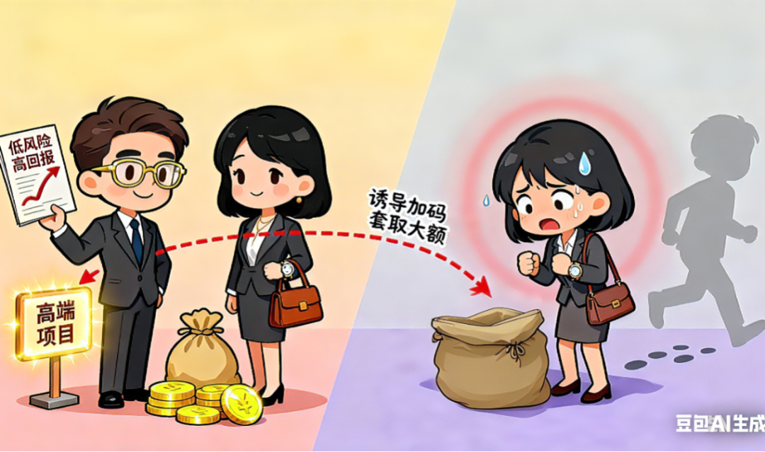 骗子先以“低风险高回报”诱导小额获利,再推“高端项目”套取大额资金,最后以“系统维护”“账户冻结”等借口拖延提现,最后关闭平台、拉黑好友,携款消失。