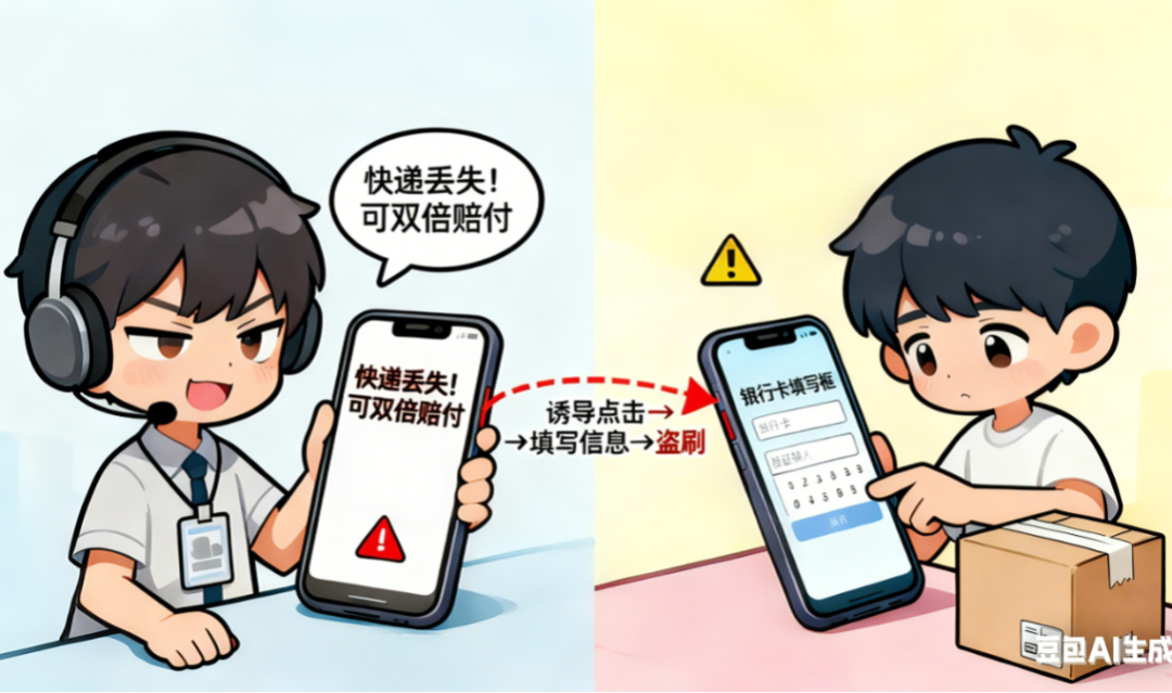 骗子先通过非法手段获取快递信息,让受害者放松警惕,再用高额理赔诱惑点击钓鱼链接,套取银行卡信息和验证码,从而盗走钱财。